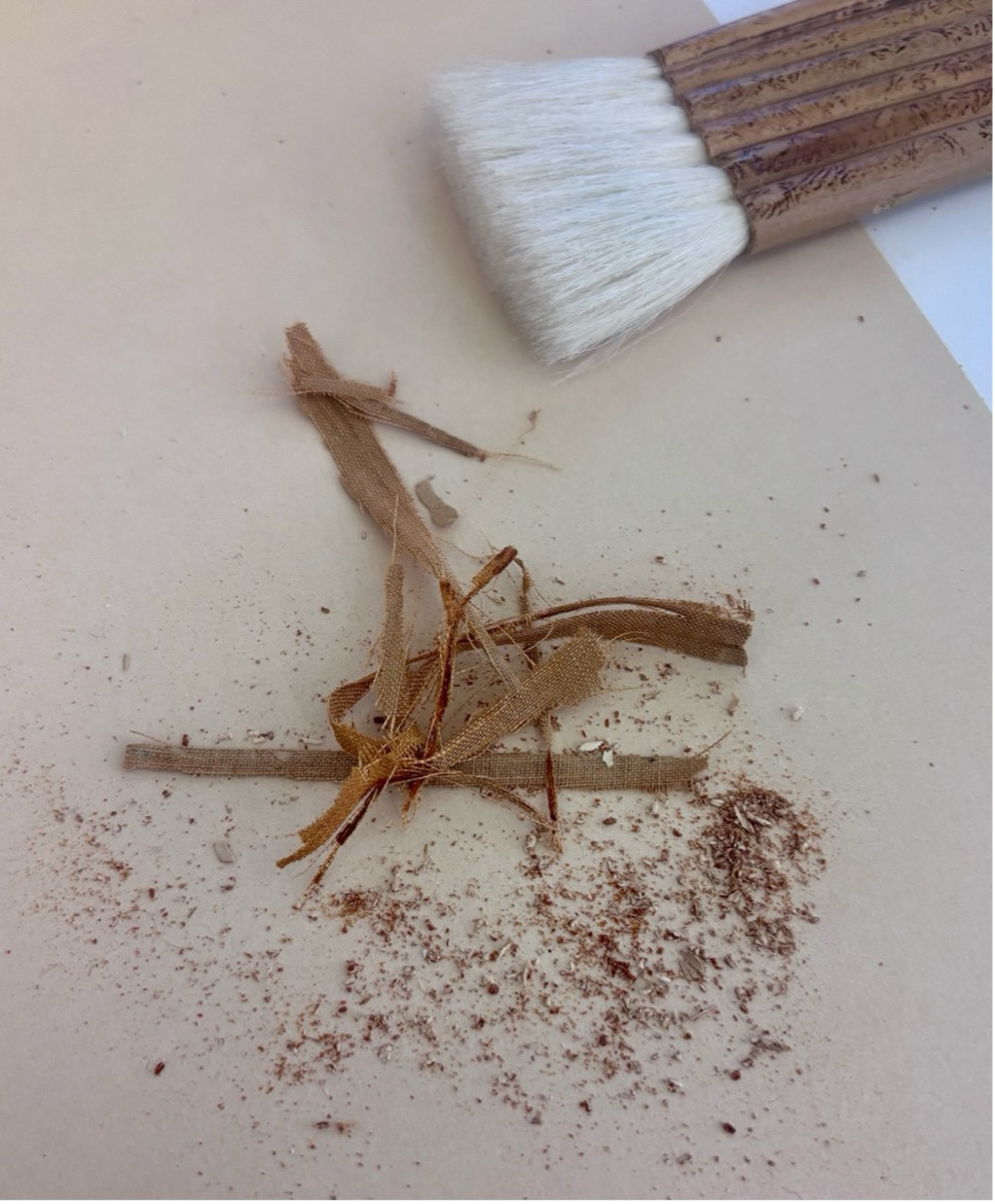 Treatment began by using sandpaper to reduce the bulk of the degraded adhesive from the spine of the textblock, freeing the individual leaves. I further reduced the friable adhesive by running each leaf between my fingernails (Nicole’s suggestion), not attempting to remove caoutchouc that was still firmly attached.