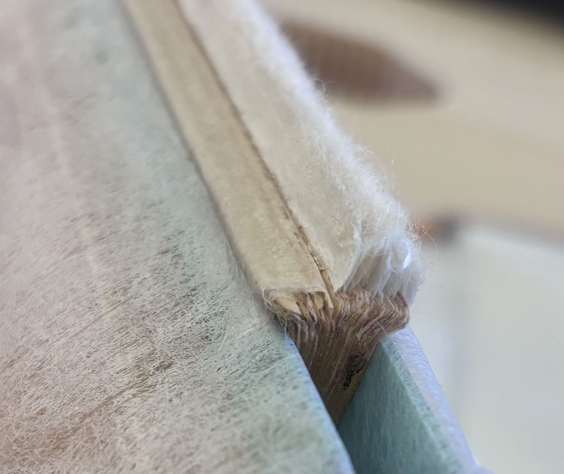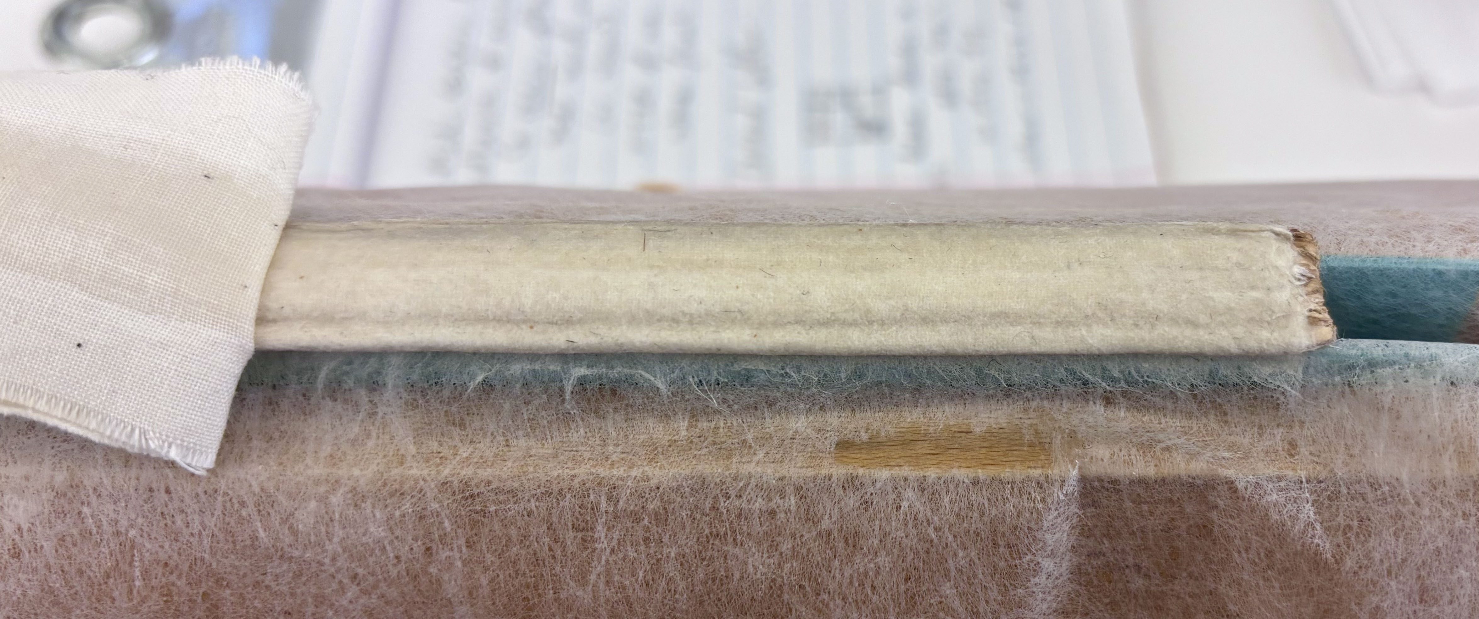 Once the textblock was back in one piece, I was able to return it to its case cover. To do this, I mechanically lifted the edges of the pastedowns from the boards, adhered the linen transverse lining to the exposed boards, and re-adhered the pastedowns to secure the textblock attachment.